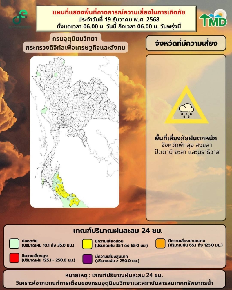 วันที่ 19 ธันวาคม 2568 กรมอุตุนิยมวิทยา พยากรณ์อากาศ 24 ชั่วโมงข้างหน้า ประเทศไทยตอนบนมีอากาศเย็นถึงหนาวในตอนเช้า และอุณหภูมิจะลดลงอีก 1-2 องศาเซลเซียส เนื่องจากบริเวณความกดอากาศสูงหรือมวลอากาศเย็นยังคงปกคลุมประเทศไทยตอนบน ในขณะที่คลื่นกระแสลมฝ่ายตะวันตกจากประเทศเมียนมาเคลื่อนเข้าปกคลุมภาคเหนือและ ภาคตะวันออกเฉียงเหนือตอนบน ขอให้ประชาชนในบริเวณดังกล่าวดูแลรักษาสุขภาพเนื่องจากสภาพอากาศที่เปลี่ยนแปลง ส่วนเกษตรกรในภาคเหนือควรเตรียมการป้องกันและระวังความเสียหายที่อาจจะเกิดต่อผลผลิตทางการเกษตร