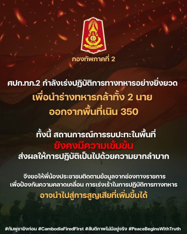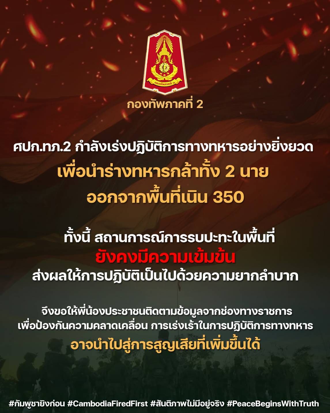 ทั้งนี้ เพจกองทัพภาคที่ 2 ขอความร่วมมือพี่น้องประชาชนให้ติดตามข้อมูลข่าวสารจากแหล่งทางราชการเป็นหลัก เพื่อป้องกันความสับสนหรือคลาดเคลื่อนของข้อมูล พร้อมย้ำว่า การเร่งเร้าหรือกดดันให้ดำเนินปฏิบัติการทางทหารอย่างเร่งด่วนเกินไป อาจส่งผลให้เกิดการสูญเสียเพิ่มเติมได้