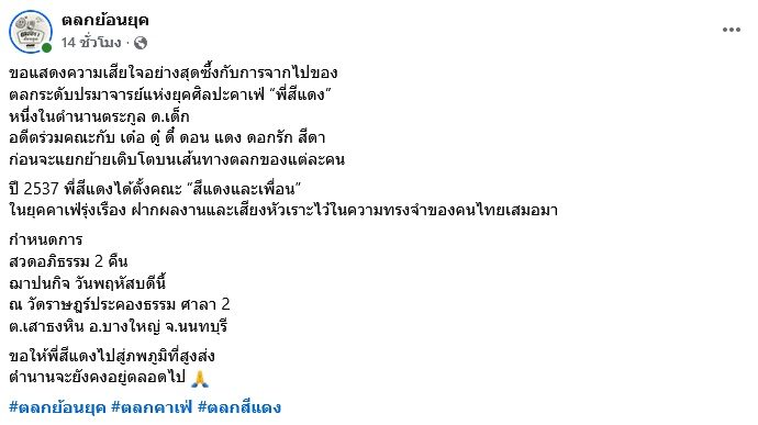วันที่ 24 ธ.ค. 68 ทางเพจ ตลกย้อนยุค ได้ออกมาเผยข่าวเศร้า ว่า ขอแสดงความเสียใจอย่างสุดซึ้งกับการจากไปของ ตลกระดับปรมาจารย์แห่งยุคศิลปะคาเฟ่ “พี่สีแดง” หนึ่งในตำนานตระกูล ด.เด็ก อดีตร่วมคณะกับ เด๋อ ดู๋ ดี๋ ดอน แดง ดอกรัก สีดา ก่อนจะแยกย้ายเติบโตบนเส้นทางตลกของแต่ละคน