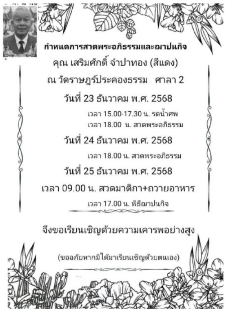 กำหนดการ สวดอภิธรรม 2 คืน ฌาปนกิจ วันพฤหัสบดีนี้ ณ วัดราษฎร์ประคองธรรม ศาลา 2 ต.เสาธงหิน อ.บางใหญ่ จ.นนทบุรี