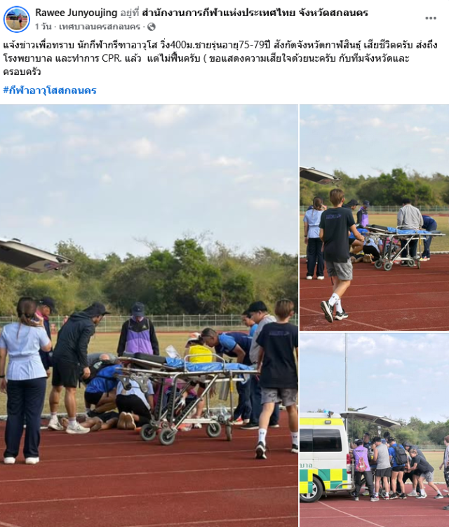 เมื่อวันที่ 1 กุมภาพันธ์ 2569 มีรายงานว่า มีผู้ใช้เฟซบุ๊กรายหนึ่ง ได้โพสต์รูปภาพพร้อมข้อความ ผ่านเฟซบุ๊ก Rawee Junyoujing ซึ่งได้มีการเช็กอินโพสต์ดังกล่าวอยู่ที่ สำนักงานการกีฬาแห่งประเทศไทย จังหวัดสกลนคร โดยระบุว่า แจ้งข่าวเพื่อทราบ นักกีฬากรีฑาอาวุโส วิ่ง 400 ม.ชาย รุ่นอายุ 75-79 ปี สังกัดจังหวัดกาฬสินธุ์ เสียชีวิตครับ