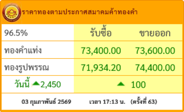 ราคาทองคำประจำวันที่ 3 ก.พ.2569 ผันผวนต่อเนื่อง ดีดแรง 2,450 บาท เปรียบเทียบกับราคาสุดท้ายของวันที่ 2 ก.พ.ที่ผ่านมา โดยราคาทองรูปพรรณขยับมาอยู่ที่บาทละ 74,400.00 บาท อ้างอิงข้อมูลล่าสุดจาก สมาคมค้าทองคำ ที่เผยแพร่ผ่านทางเว็บไซต์ เมื่อเวลา 17:13 น.ปรับครั้งสุดท้าย ครั้งที่ 63