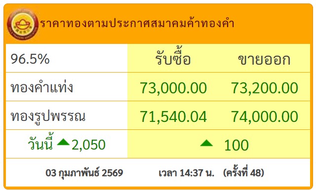 ราคาทองคำประจำวันที่ 3 ก.พ.2569 ผันผวนต่อเนื่อง ดีดแรง 2,050 บาท เปรียบเทียบกับราคาสุดท้ายของวันที่ 2 ก.พ.ที่ผ่านมา โดยราคาทองรูปพรรณขยับมาอยู่ที่บาทละ 74,000.00 บาท อ้างอิงข้อมูลล่าสุดจาก สมาคมค้าทองคำ ที่เผยแพร่ผ่านทางเว็บไซต์ เมื่อเวลา 14:37 น.ปรับครั้งที่ 48