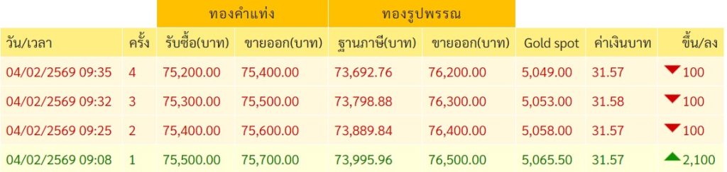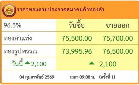 ราคาทองวันนี้ 4 กุมภาพันธ์ 2569 โดย สมาคมค้าทองคำ ประกาศราคาทองครั้งที่ 1 (เปิดตลาด) เมื่อเวลา 09.08 น. ปรับตัวขึ้นพรวดเดียว 2,100 บาท สู่บริเวณ 75,700 บาท เมื่อเทียบกับประกาศราคาซื้อขายครั้งสุดท้ายของเมื่อวาน(อังคาร) ที่ระหว่างวันมีการประกาศราคาทองคำทั้งหมดมากถึง 63 ครั้ง รวมราคาปรับตัวเพิ่มขึ้นแรง 2,450 บาท