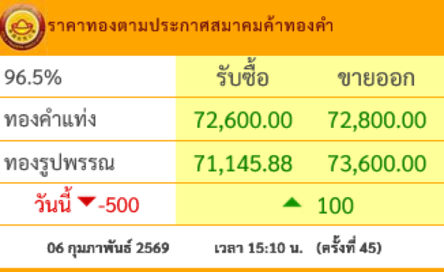 ราคาทองคำประจำวันที่ 6 ก.พ.2569 ปรับลดลง โดยราคาทองรูปพรรณขยับมาอยู่ที่บาทละ 73,600.00 บาท อ้างอิงข้อมูลล่าสุดจาก สมาคมค้าทองคำ ที่เผยแพร่ผ่านทางเว็บไซต์ เมื่อเวลา 15:10 น.ปรับ(ครั้งที่ 45)