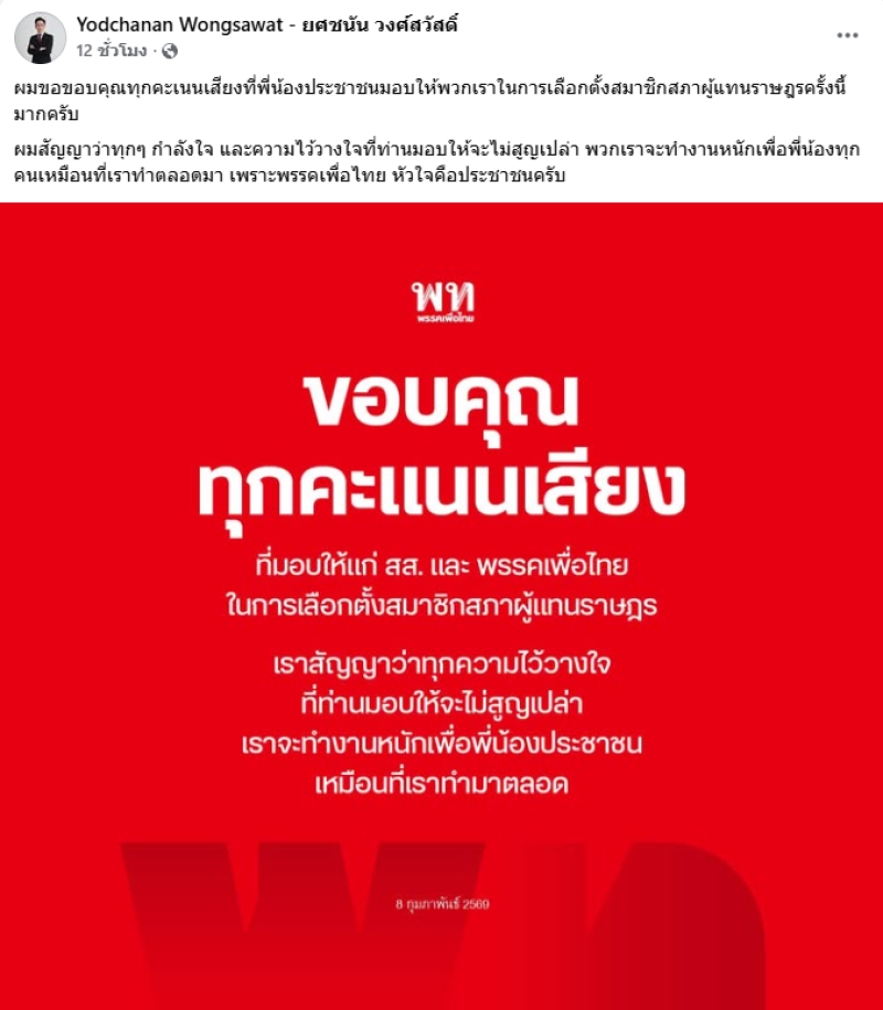 ผมสัญญาว่าทุกๆ กำลังใจ และความไว้วางใจที่ท่านมอบให้จะไม่สูญเปล่า พวกเราจะทำงานหนักเพื่อพี่น้องทุกคนเหมือนที่เราทำตลอดมา เพราะพรรคเพื่อไทย หัวใจคือประชาชนครับ