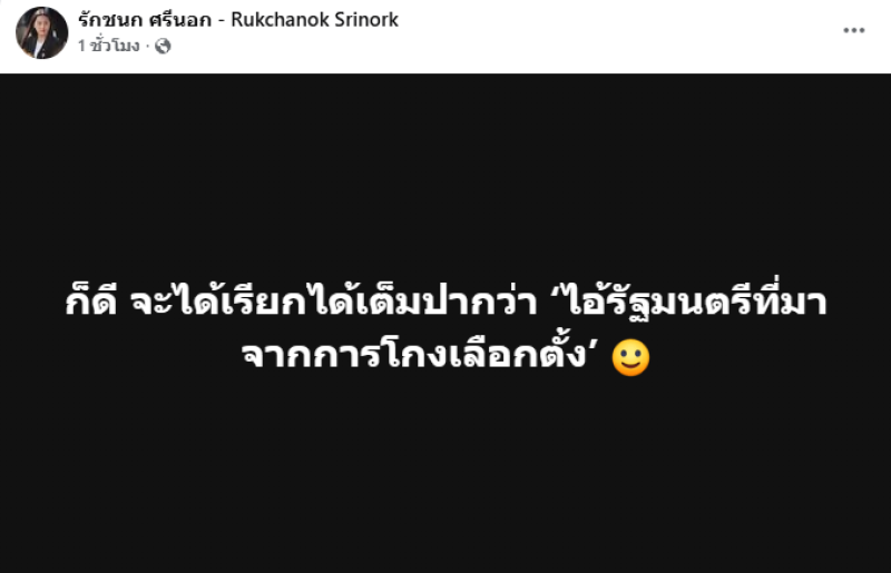 ภายหลังการแถลงข่าว ไอซ์ รักชนก ได้เคลื่อนไหวผ่านเฟซบุ๊กชื่อ รักชนก ศรีนอก – Rukchanok Srinork โดยระบุข้อความว่า ก็ดี จะได้เรียกได้เต็มปากว่า ไอ้รัฐมนตรีที่มาจากการโกงเลือกตั้ง