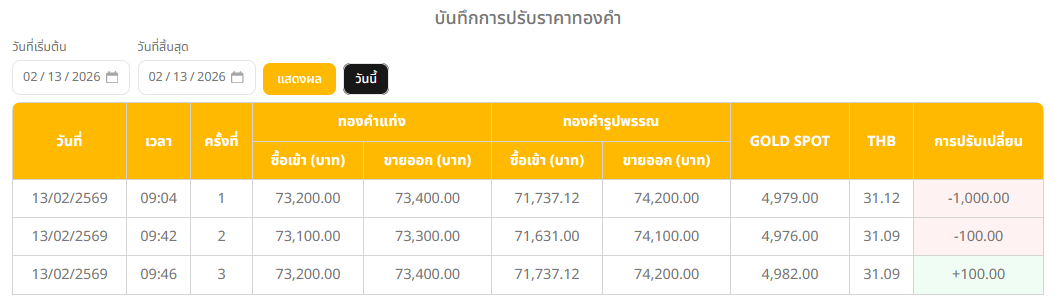 ราคาทองคำวันนี้ 13 กุมภาพันธ์ 2569 โดย สมาคมค้าทองคำ ประกาศราคาทองครั้งที่ 1 (เปิดตลาด) เมื่อเวลา 09.04 น. ปรับตัวลงแรงพรวดเดียว 1,000 บาท แตะ 73,400 บาท