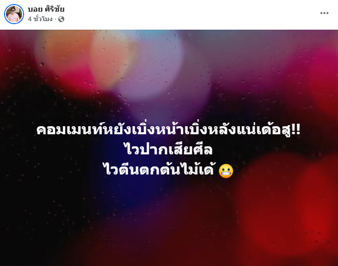 ล่าสุด ทางบอย ได้ออกมาโพสต์ว่า คอมเมนท์หยังเบิ่งหน้าเบิ่งหลังแน่เด้อสู!! ไวปากเสียศีล ไวตีxตกต้นไม้เด้ และอีกโพสต์ได้เผยว่า สื่อสารผิดพลาดยังไงผมไม่สามารถทราบได้ครับ แต่!! เพจต้นเรื่องก็ตั้งกระทู้ค่อนข้างที่จะเจาะจงอย่างชัดเจนใครอ่านก็ต้องอ๋อ!! ส่วนคนที่คอมเม้นต์ ก็เม้นโดยที่ยังไม่มีมูลความจริงได้โอกาสเหยียบ ก็เหยียบลงทันที พร้อมที่จะทำร้ายคนอื่น ความอยากซ้ำเติมคนอื่น หน้ามืดตามัว สนุกคึกคะนอง สรรหาคำแย่ๆมาคอมเมนต์ไม่สนว่ามันจะกระทบหรือสร้างความเสียหายให้ใคร แต่สุดท้ายผมเชื่อว่ามันจะเป็นบาปในใจครับ