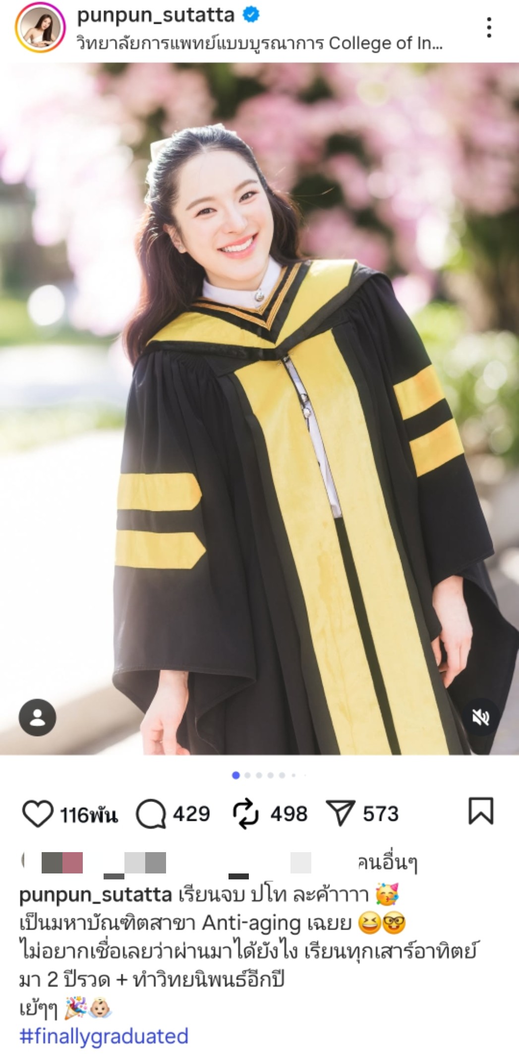 ที่น่าชื่นชมคือ ตลอดระยะเวลาที่ศึกษา สาวปันปันก็ได้นำความรู้ด้าน Anti-aging มาปรับใช้กับตัวเองอย่างเห็นได้ชัด จนทำให้สุขภาพดี หุ่นเป๊ะปัง และผิวพรรณสดใสยิ่งกว่าเดิม! งานนี้แฟน ๆ ต่างลุ้นกันตัวโก่งว่า มหาบัณฑิตคนเก่ง มีแพลนจะเดินหน้าเรียนต่อในระดับปริญญาเอกเลยหรือไม่ หรือจะใช้ความรู้ที่ได้มาต่อยอดธุรกิจด้านสุขภาพและความงามให้ปังไปอีกขั้น! ยังไงก็ขอแสดงความยินดีกับ คุณมหาบัณฑิตคนสวย คนนี้ด้วยนะคะ ที่ตอนนี้เรียกได้ว่า ลัคกี้อินเกมส์ ลัคกี้อินเลิฟ สมบูรณ์แบบทุกด้านจริง ๆ ค่ะ!