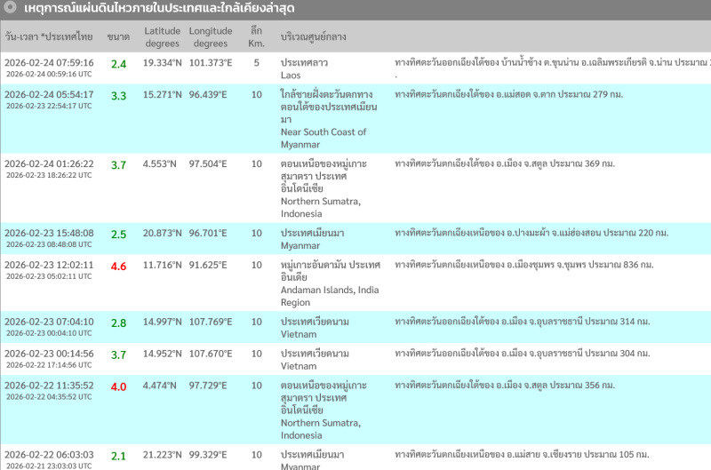 24 ก.พ. 69 เหตุการณ์แผ่นดินไหวภายในประเทศและใกล้เคียงล่าสุด