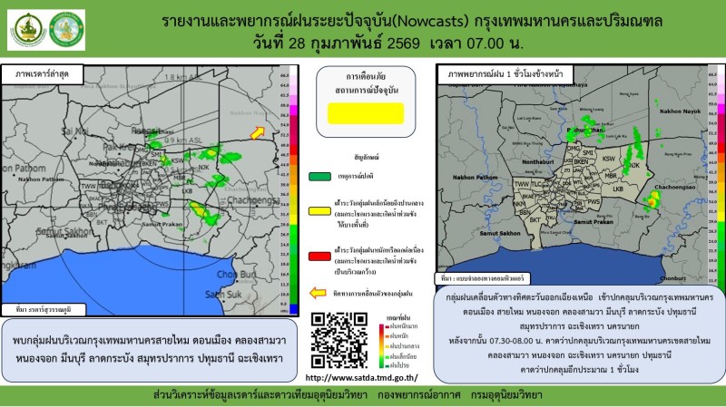 วันที่ 28 กุมภาพันธ์ 2569 กรมอุตุนิยมวิทยา รายงานสถานการณ์ฝนฟ้าคะนองในพื้นที่กรุงเทพมหานครและจังหวัดใกล้เคียง โดยตรวจพบกลุ่มฝนกำลังก่อตัวและปกคลุมบริเวณเขตสายไหม ดอนเมือง คลองสามวา หนองจอก มีนบุรี ลาดกระบัง รวมถึงพื้นที่จังหวัดสมุทรปราการ ปทุมธานี และฉะเชิงเทรา