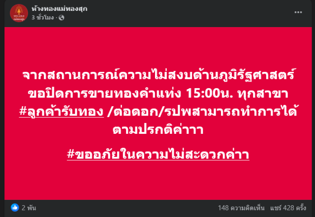 วันที่ 28 กุมภาพันธ์ 2569 มีรายงานว่า เพจเฟซบุ๊ก ห้างทองแม่ทองสุก ได้โพสต์ข้อความระบุว่า จากสถานการณ์ความไม่สงบด้านภูมิรัฐศาสตร์ ขอปิดการขายทองคำแท่ง 15:00น. ทุกสาขา #ลูกค้ารับทอง /ต่อดอก/รปพสามารถทำการได้ตามปรกติค่าาา #ขออภัยในความไม่สะดวกค่าา