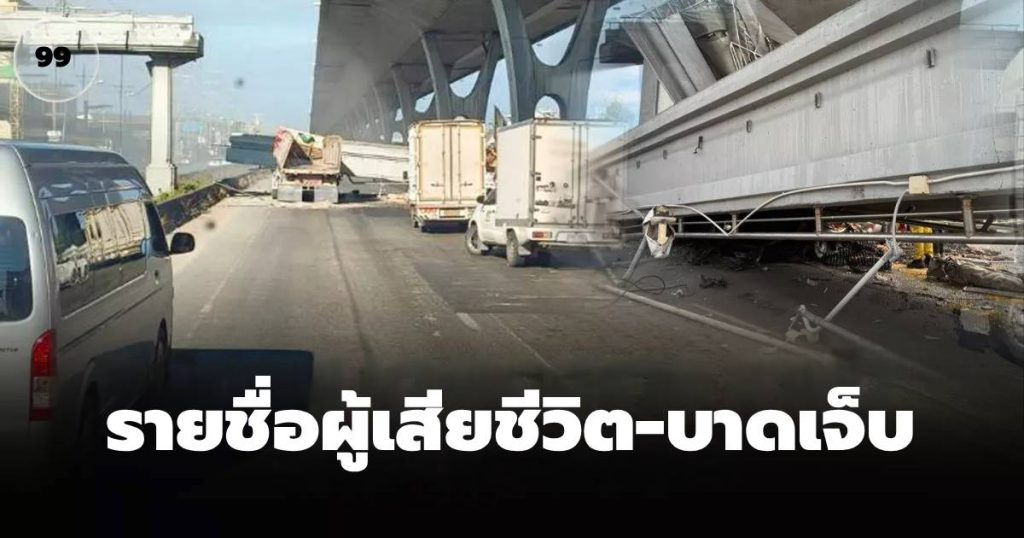 สำหรับรายชื่อผู้บาดเจ็บ และผู้เสียชีวิต ทราบชื่อในเวลาต่อมาคือ นายสังเวียน เมฆเขียว คนขับกระบะบรรทุกไข่ ส่วนผู้บาดเจ็บอีก 1 ราย เป็นโชเฟอร์รถบรรทุกพ่วง22ล้อ ขนดิน ทราบชื่อ คือ นายลือชัย บัวเผียน อายุ 65 ปี ถูกคานสะพานทับได้รับบาดเจ็บ สามารถช่วยเหลือก่อนนำตัวส่งโรงพยาบาลรามาธิบดีจักรีนฤบดินทร์ บางนา